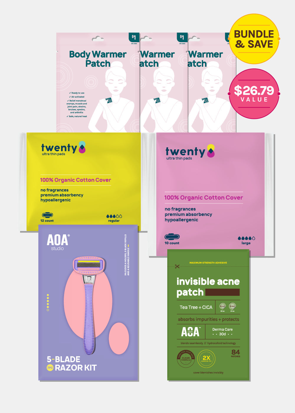It's that time of month.... every month. This kit has everything you need for self care! From 2 value packs of organic cotton sanitary pads, to acne patches, razor kit and 3 body warmers to help cure those cramps!